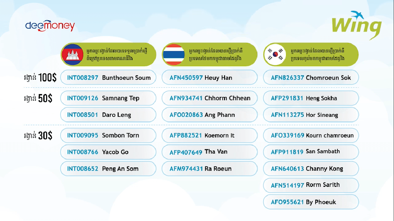 At the same time, Wing is happy to announce this month’s 20 new winners who transfer the money from either South Korea or Thailand and those who receive the remittance within Cambodia from October 15 to November 14, 2018 via their Wing account. Prizes that the customers will receive are 30USD (11 prizes), 50USD (06 prizes), and 100USD (03 prizes) respectively distributed in different category and corridors.