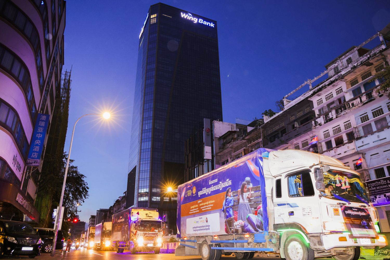 Eleven trucks loaded with essential food items and daily necessities departed from Wing Bank Tower in Phnom Penh, heading to Koh Kong and Pursat provinces to assist families displaced by the recent border conflict.