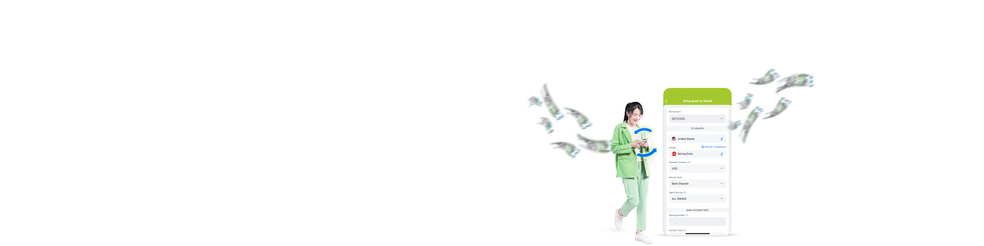 - Can perform on Wing Bank App, branches, and at any Wing agents with the MoneyGram logo with fast, secure, and convenient