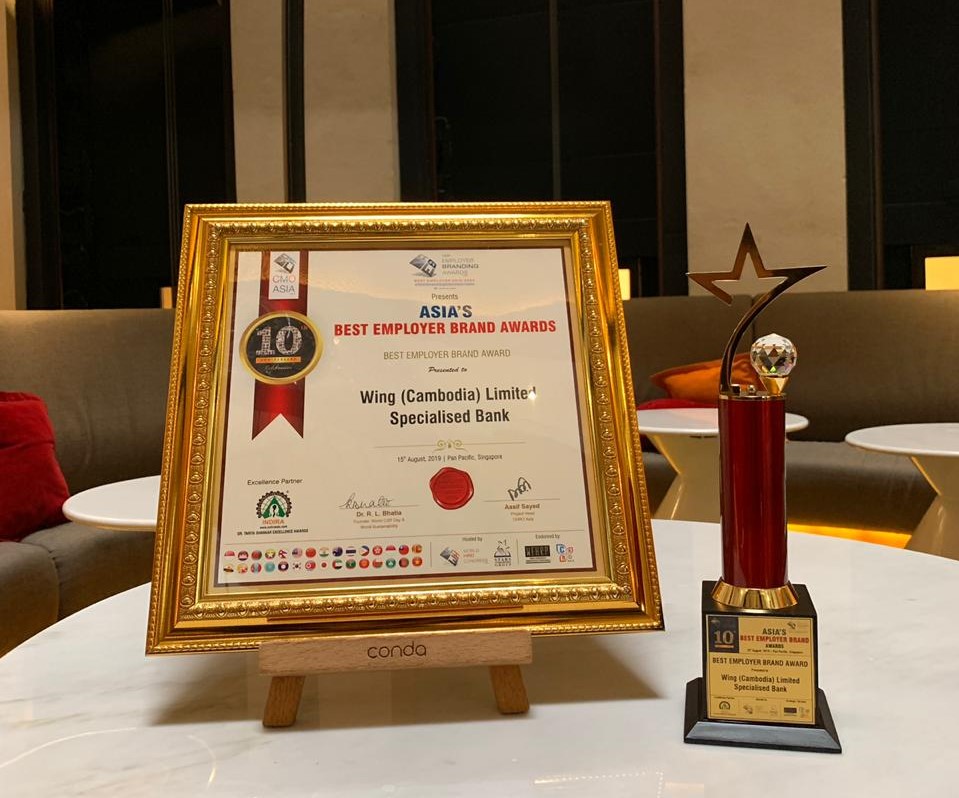 ភ្នំពេញ៖ ធនាគារឯកទេសវីង ដែលជាធនាគារឈានមុខគេក្នុងការផ្តល់សេវាធនាគារចល័តនៅកម្ពុជា មានកិត្តិយសដែលទទួលបានពានរង្វាន់និយោជកឆ្នើម បួនលើកផ្ទួនៗ ប្រចំាតំបន់អាស៊ី នៅក្នុងកម្មវិធី Asia’s Best Employer Brands 2019 នៅថ្ងៃព្រហស្បត្តិ៍ទី ១៥ ខែសីហា ឆ្នាំ ២០១៩ ។ ដែលរៀបចំឡើងដោយវិទ្យាស្ថាន Employer Branding នៅប្រទេសសិង្ហបុរី។