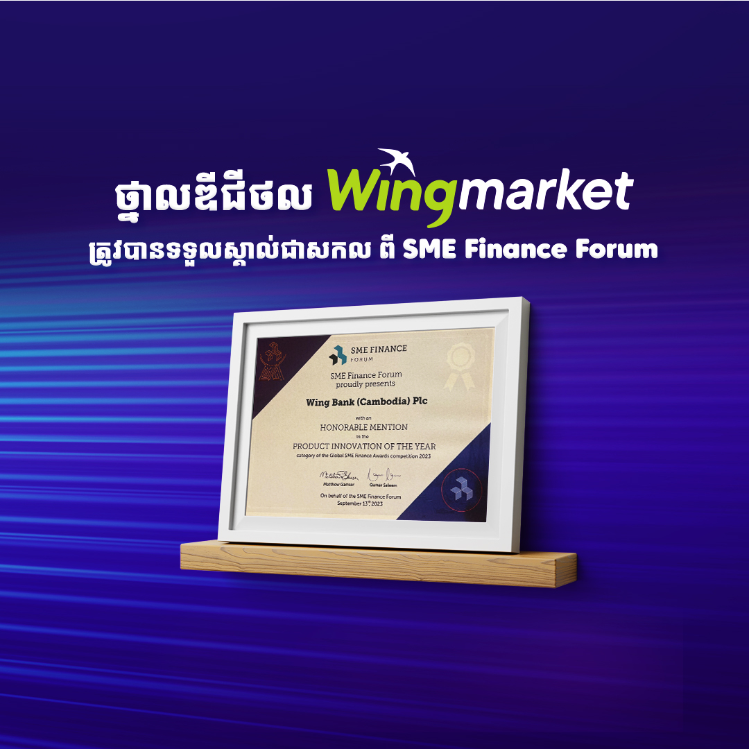 ថ្នាលឌីជីថល Wingmarket ទទួលបានការទទួលស្គាល់ថាជាថ្នាលឌីជីថលដែលមានភាពច្នៃប្រឌិតក្នុងចំណោមបច្ចេកវិទ្យាហិញ្ញវត្ថុ នៅក្នុងកម្មវិធី​ផ្តល់​ពានរង្វាន់ហិរញ្ញប្បទាន​សហគ្រាស​ធុន​តូច និង​មធ្យម សកលលោក ឆ្នាំ២០២៣ (Global SME Finance Awards 2023) សម្រាប់ “ពានរង្វាន់ភាពច្នៃប្រឌិតលើផលិតផលប្រចាំឆ្នាំ ២០២៣” (Product Innovation of the Year Award for 2023) ។ កម្មវិធីប្រគល់ពានរង្វាន់នេះ ត្រូវបានរៀបចំឡើងកាលពីពេលថ្មីៗកន្លងទៅ នៅទីក្រុងបុមបៃ ប្រទេសឥណ្ឌា។