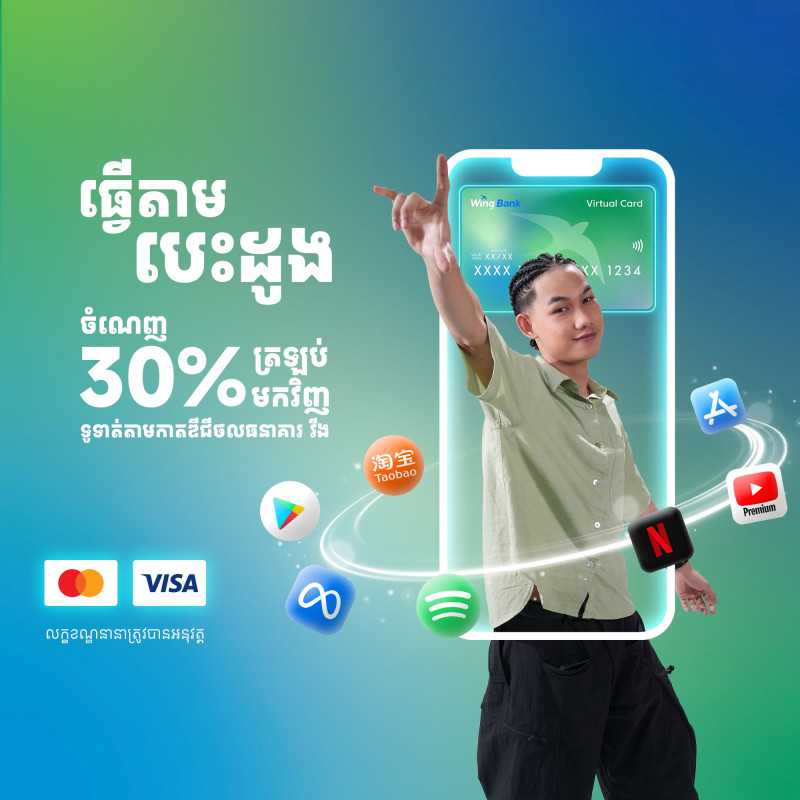 ទទួលបានលុយត្រឡប់ 30% សម្រាប់អតិថិជនថ្មី ដែលបានបើក វីង វីសា ឌីជីថលកាត ឬម៉ាស្ទ័រកាត ឌីជីថល ហើយទូទាត់ការចំណាយ ជាមួយនឹងដៃគូរបស់យើង ដែលមានដូចជា៖ Meta, Taobao, Spotify, YouTube Premium, Netflix, App Store, និង Play Store ជាដើម។