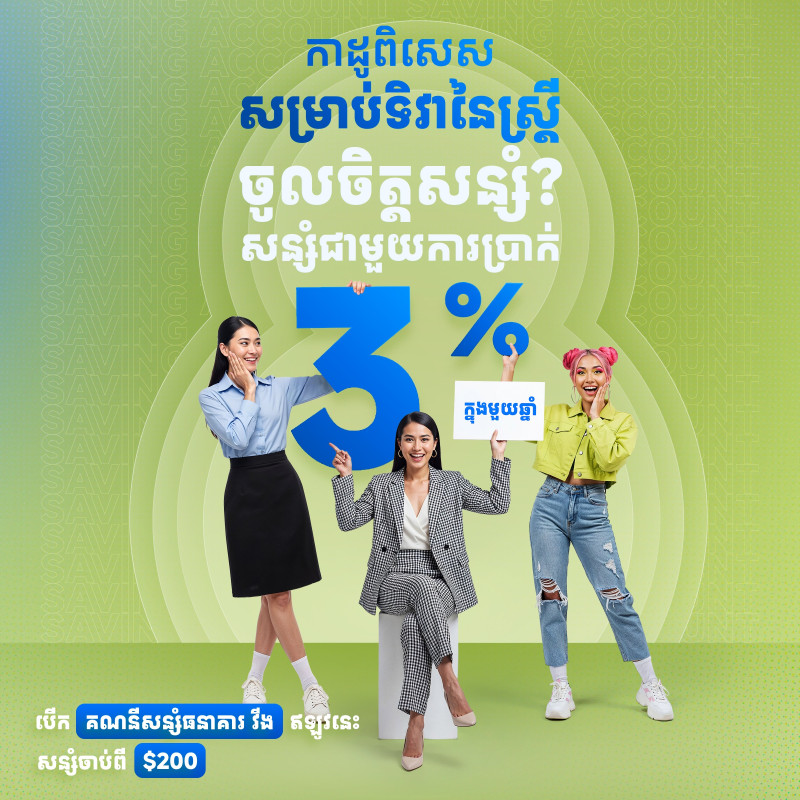 - ទទួលបានអត្រាការប្រាក់ 3% ក្នុងមួយឆ្នាំ សម្រាប់គណនីសន្សំដែលមានសិទ្ធិ