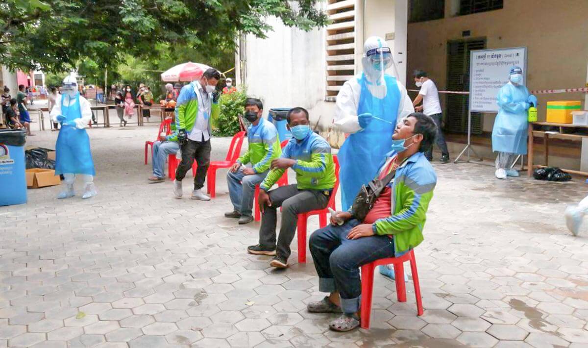 អ្នកដឹកជញ្ជូនវីងម៉លនៅខេត្ត សៀមរាប រង់ចាំការធ្វើតេស្តរកមេរោគកូវីដ១៩ ។