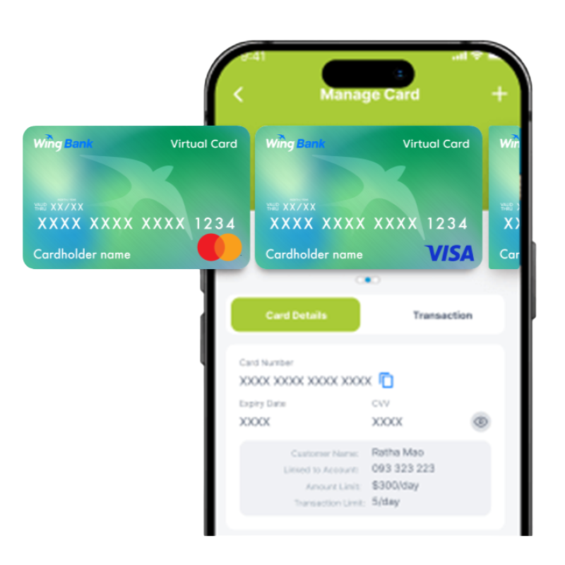 វីង វីសា និង វីង ម៉ាស្ទ័រកាត ឌីជីថល គឺជាដំណោះស្រាយដ៏ល្អឥតខ្ចោះសម្រាប់ អ្នក។ ដូចគ្នាជាមួយកាតដទៃ កាតឌីជីថលនេះអាចឲ្យអ្នកប្រើប្រាស់សម្រាប់ការទូទាត់ដែលមានដូចជា កក់កន្លែងស្នាក់នៅសម្រាប់វិស្សមកាល កក់សំបុត្រ ទិញអាហារ ឬទិញទំនិញនៅតាមហាង ឬអនឡាញ និងច្រើនទៀតយ៉ាងងាយស្រួល និងមានសុវត្ថិភាព។
