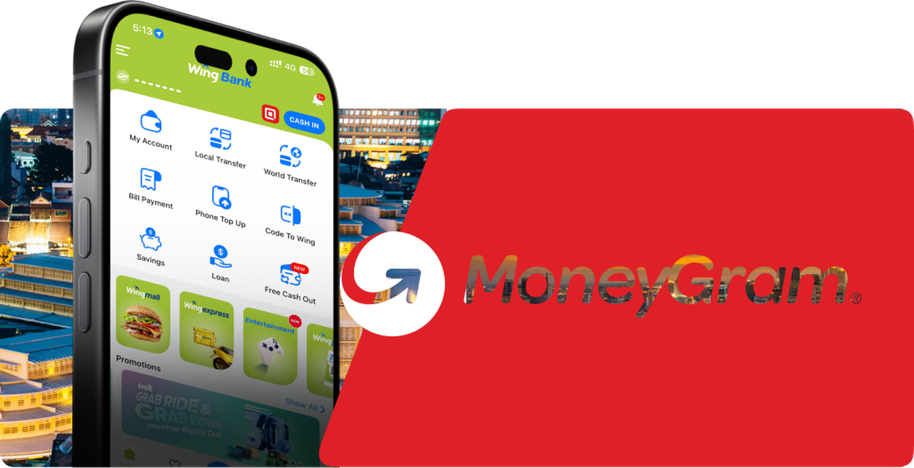 ធនាគារ វីង កំពុងពង្រីកសេវាផ្ទេរប្រាក់អន្តរជាតិជាមួយ MoneyGram ដោយអនុញ្ញាតឱ្យអតិថិជនទាំងអស់ផ្ទេរនិងទទួលប្រាក់ពីប្រទេសកម្ពុជាតាមរយៈអេប Wing Bank ឬនៅ វីងគ្រប់ទីតាំង ទៅកាន់គ្រួសារ ឬដៃគូអាជីវកម្មទូទាំងពិភពលោកដោយរហ័ស សុវត្ថិភាព និងងាយស្រួល។