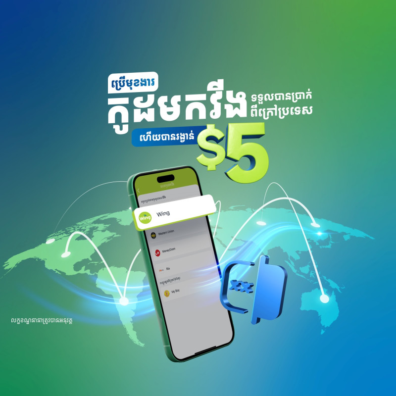 ទទួលប្រាក់ពីក្រុមគ្រួសារ ឬមិត្តភក្តិនៅក្រៅប្រទេសបានភ្លាមៗជាមួយធនាគារ វីង ហើយរីករាយជាមួយប្រាក់ត្រឡប់ $5 មកវិញ នៅពេលអ្នកប្រើប្រាស់មុខងារកូដទៅវីង សម្រាប់ការទទួលប្រាក់លើកដំបូង។