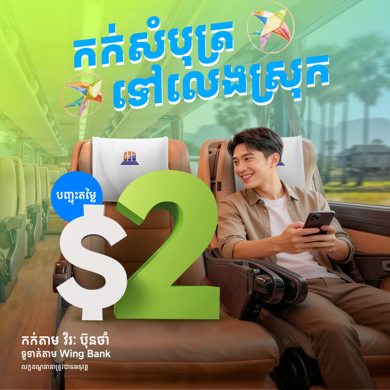 មិនថាលោកអ្នកត្រូវធ្វើដំណើរទៅតាមបណ្តាខេត្ត ឬគ្រោងធ្វើដំណើរកម្សាន្តនោះទេ ការធ្វើដំណើររបស់លោកអ្នកនឹងកាន់តែចំណេញ។ ដោយគ្រាន់តែធ្វើការទូទាត់តាម ធនាគារ វីង សម្រាប់ការកក់សំបុត្រធ្វើដំណើរជាមួយក្រុមហ៊ុន វិរៈ ប៊ុនថាំ (VET) លោកអ្នកនឹងទទួលបានការបញ្ចុះតម្លៃ $2 ភ្លាមៗ។ ការបញ្ចុះតម្លៃនេះគឺមិនកំណត់ចំនួនទឹកប្រាក់ចំណាយ និងចំនួនទឹកប្រាក់ដែលផ្តល់ជូនឡើយ—កាន់តែធ្វើដំណើរ កាន់តែចំណេញ!
